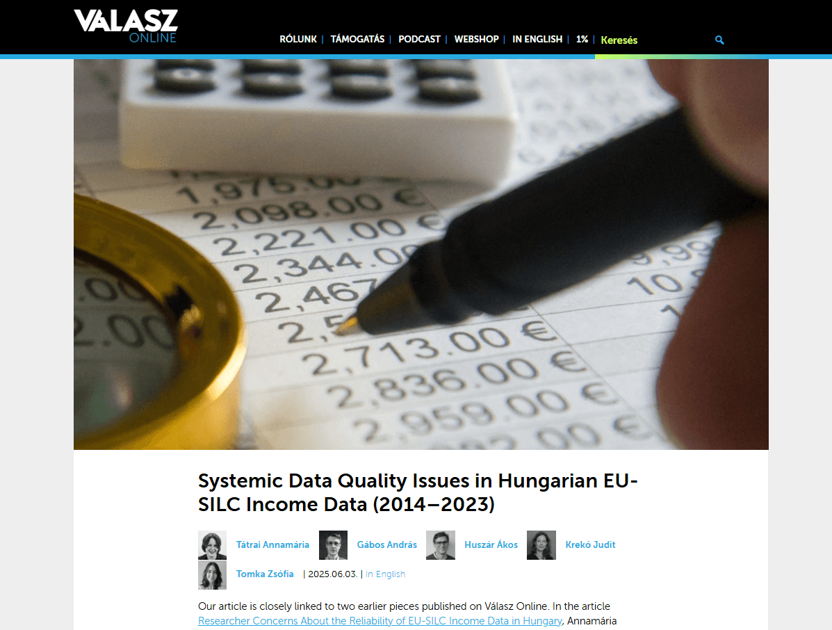 A new article has been published on Válasz Online titled "Systemic Data Quality Issues in Hungarian EU-SILC Income Data (2014–2023)," presenting further results from our research on data quality. In this piece, we delve deeper into the problems identified in the dataset, report on the findings of our research conducted since the first article, and offer recommendations for restoring trust in the quality of the data.