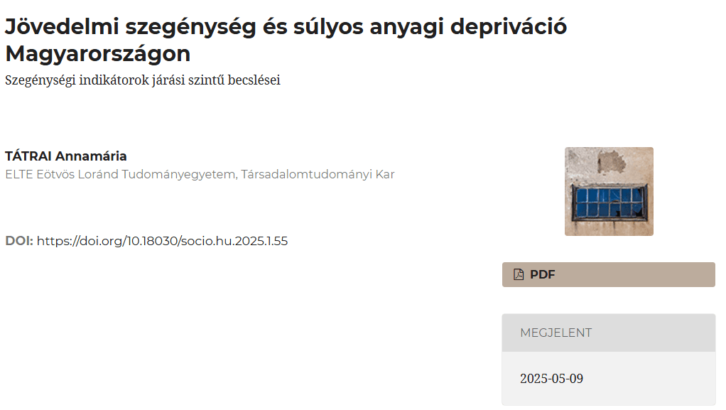 In the latest issue of socio.hu, published on May 9, 2025, a summary of Annamária Tátrai’s dissertation was published in the “Theses” section under the title “Income Poverty and Severe Material Deprivation in Hungary: District-Level Estimates of Poverty Indicators.” The aim of the study is to assess and describe the two faces of poverty—relative income poverty and severe material deprivation—to present trends in poverty indicators between 2005 and 2018, and to estimate the territorial distribution of these indicators. For an English version of the dissertation, see "Income poverty and severe material deprivation in Hungary—A district-level small area estimation project."