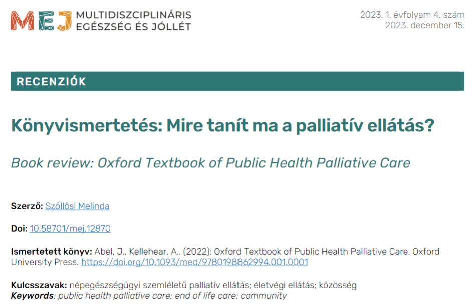 Megjelent végre a palliatív ellátás újabb nagy jelentőségű kiadványáról írt magyar nyelvű recenziónk a Multidiszciplináris Egészség és Jóllét folyóiratban. Az új magyar szakfolyóirat személetéhez tökéletesen illeszkedik a népegészségügyi szemléletű palliatív ellátás, amelynek jelentőségét és részleteit ismerheti meg, aki kezébe veszi az Oxford University Press tankönyvét. A magyar nyelvű recenzió kifejezetten azzal a céllal készült, hogy a magyar szakma és társadalom számára tegye könnyen elérhetővé ennek a megközelítésnek a bemutatását.