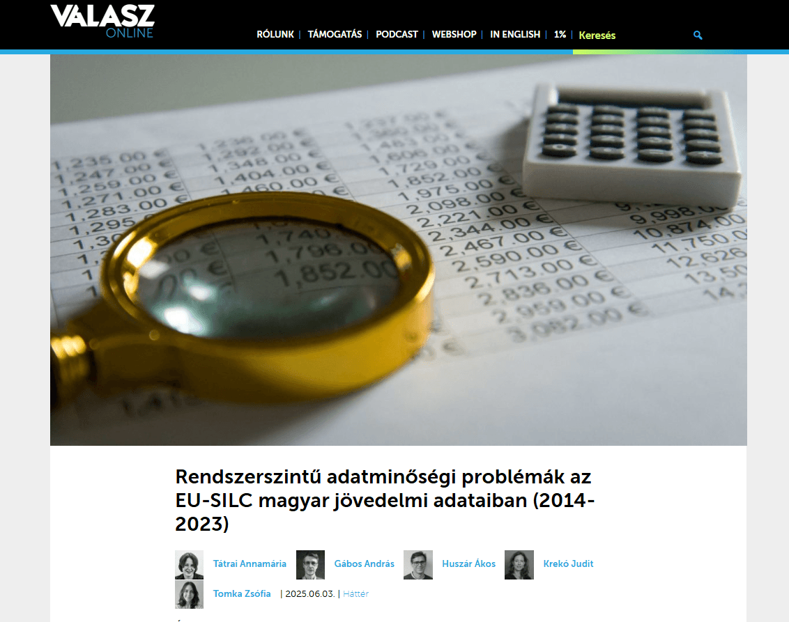 Újabb cikk jelent meg a Válasz Online oldalán az adatminőséggel kapcsolatos kutatásunk eredményeit illetően "Rendszerszintű adatminőségi problémák az EU-SILC magyar jövedelmi adataiban (2014-2023)" címmel. A cikkben tovább tárgyaljuk az adatokkal kapcsolatban felmerült problémákat, az első cikk óta végzett kutatásunk eredményeiről is beszámolunk, valamint javaslatokat teszünk az adatminőségbe vetett bizalom helyreállításáért.