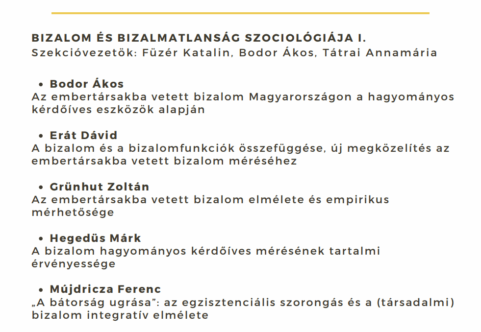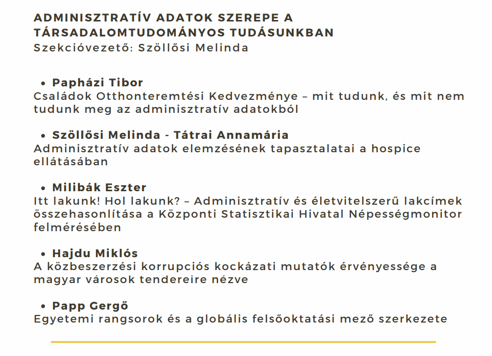 A Magyar Szociológiai Társaság éves vándorgyűlésén két szekciót is vezetünk, Szöllősi Melinda Adminisztratív adatok szerepe a társadalomtudományos tudásunkban címmel, Tátrai Annamária pedig Füzér Katalinnal és Bodor Ákossal A bizalom és bizalmatlanság szociológiája címmel. A vándorgyűlés helyszíne idén a Budapesti Corvinus Egyetem, időpontja 2023. november 17-18. Az adminisztratív adatokról szóló szekcióban kutatócsoportunk otthoni hospice ellátás területén végzett munkáját is bemutatjuk (Szöllősi, M. és Tátrai, A: Adminisztratív adatok elemzésének tapasztalatai a hospice ellátásában). A két szekció programja a következőképpen alakul: